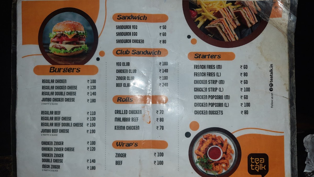At Tea Talk, the menu boasts a delightful array of favorites. Start with the Samoosa Combo or the Cutlet Combo, both priced at ₹110. For a sweet treat, indulge in their Hot Chocolate or refreshing Chickoo Shake.